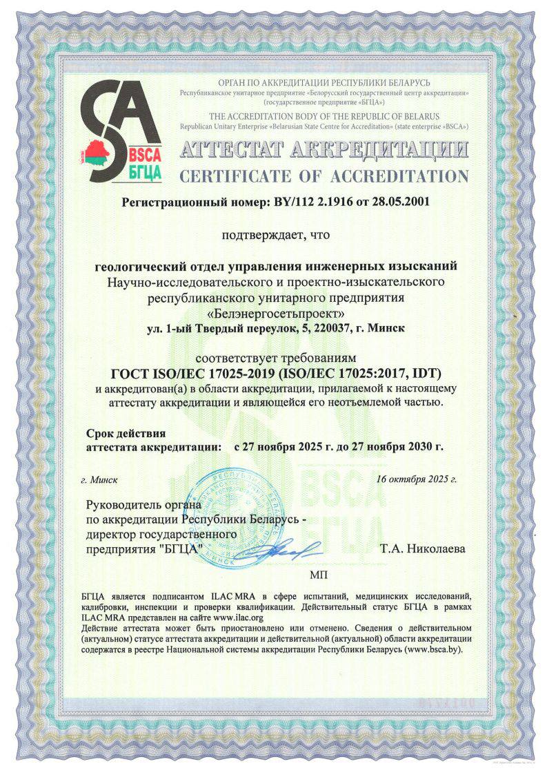 АТТЕСТАТЫ АККРЕДИТАЦИИ Аттестат аккредитации № BY/112 2.1916 от 28.05.2001 г. геологического отдела управления инженерных изысканий Аттестат аккредитации № BY/112 02.2.0.4482 от 18.04.2014 г. электротехнической лаборатории отдела учета и качества электроэнергетики Вперед